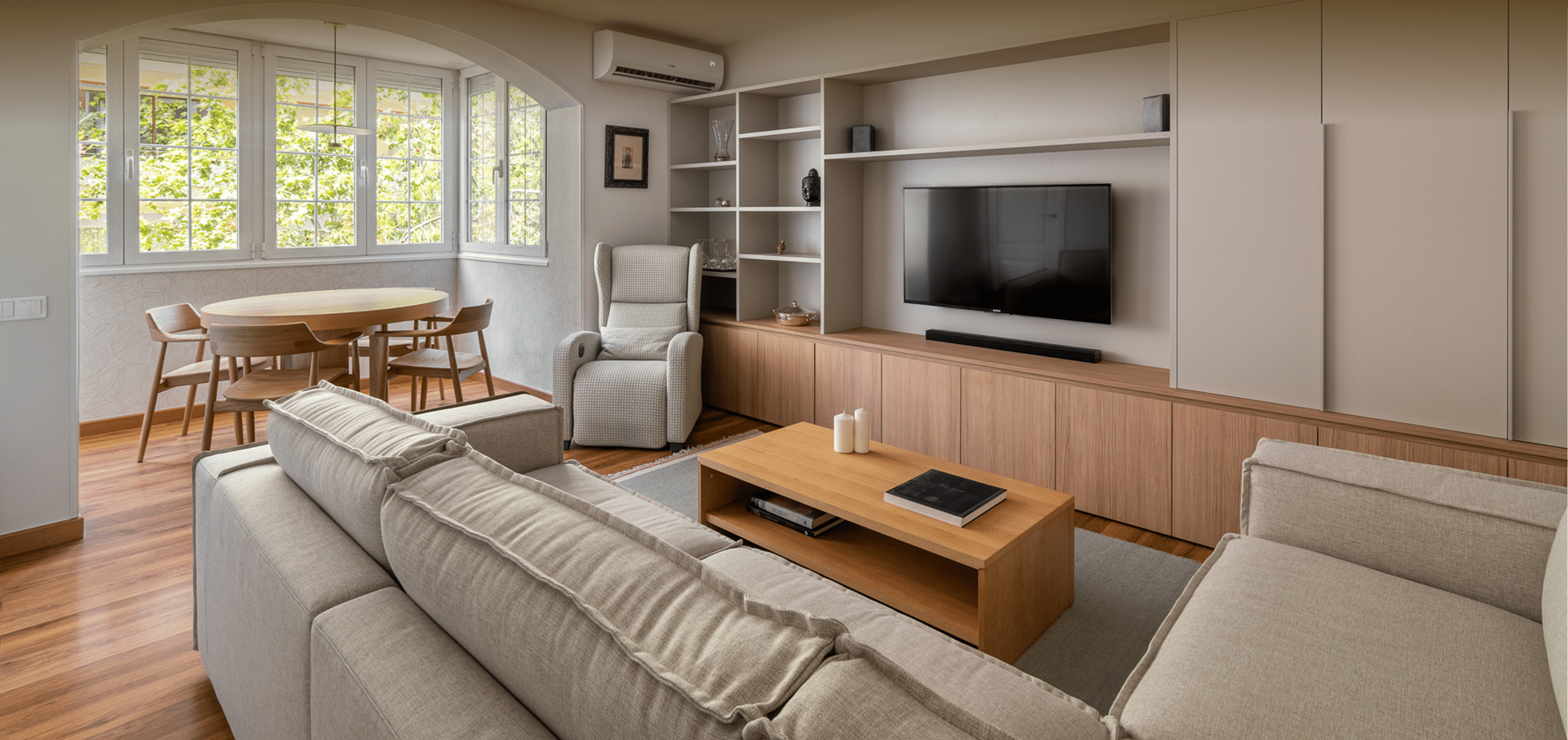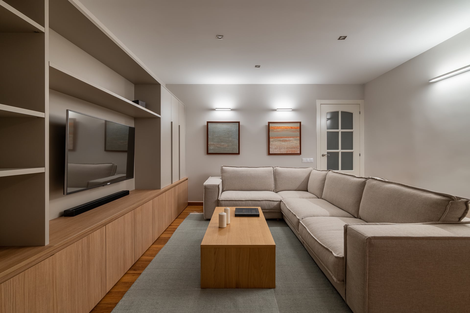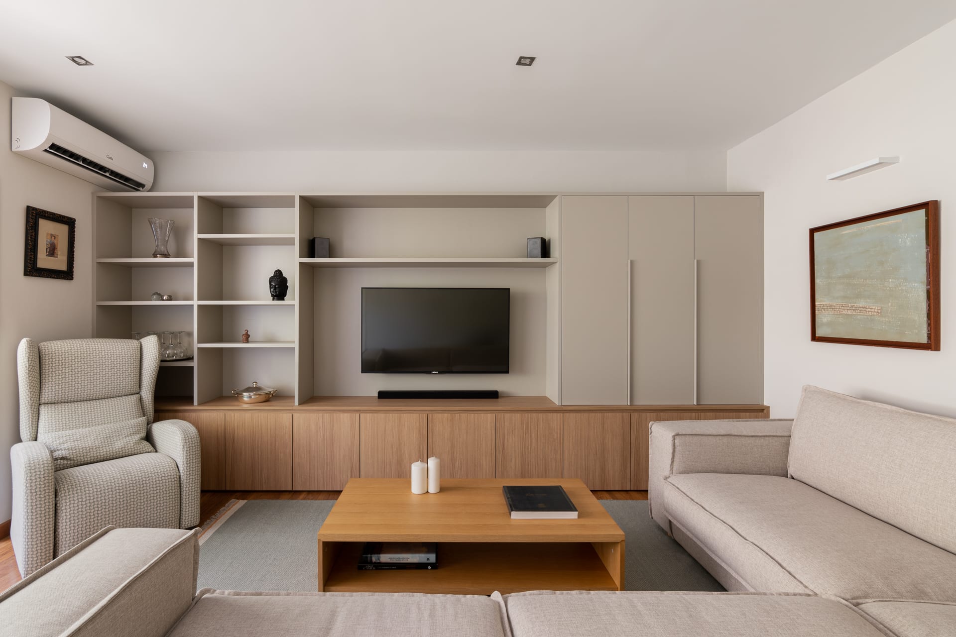 La intervenció elimina elements fixos preexistents que condicionaven la distribució —com prestatgeries i una xemeneia en desús— i aposta per un moble a mida que concentra les funcions d’emmagatzematge i televisió, ordenant visualment la zona d’estar.