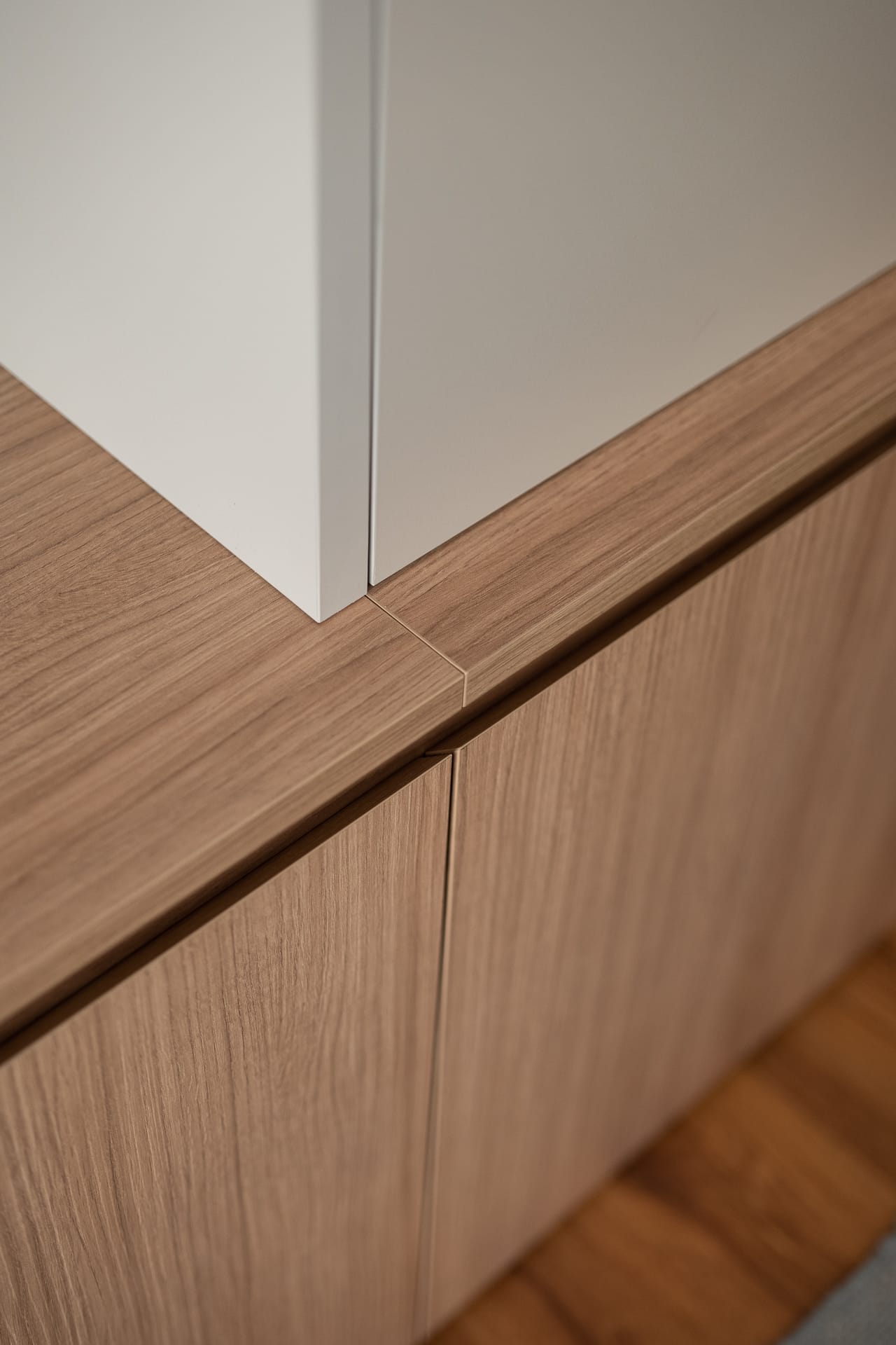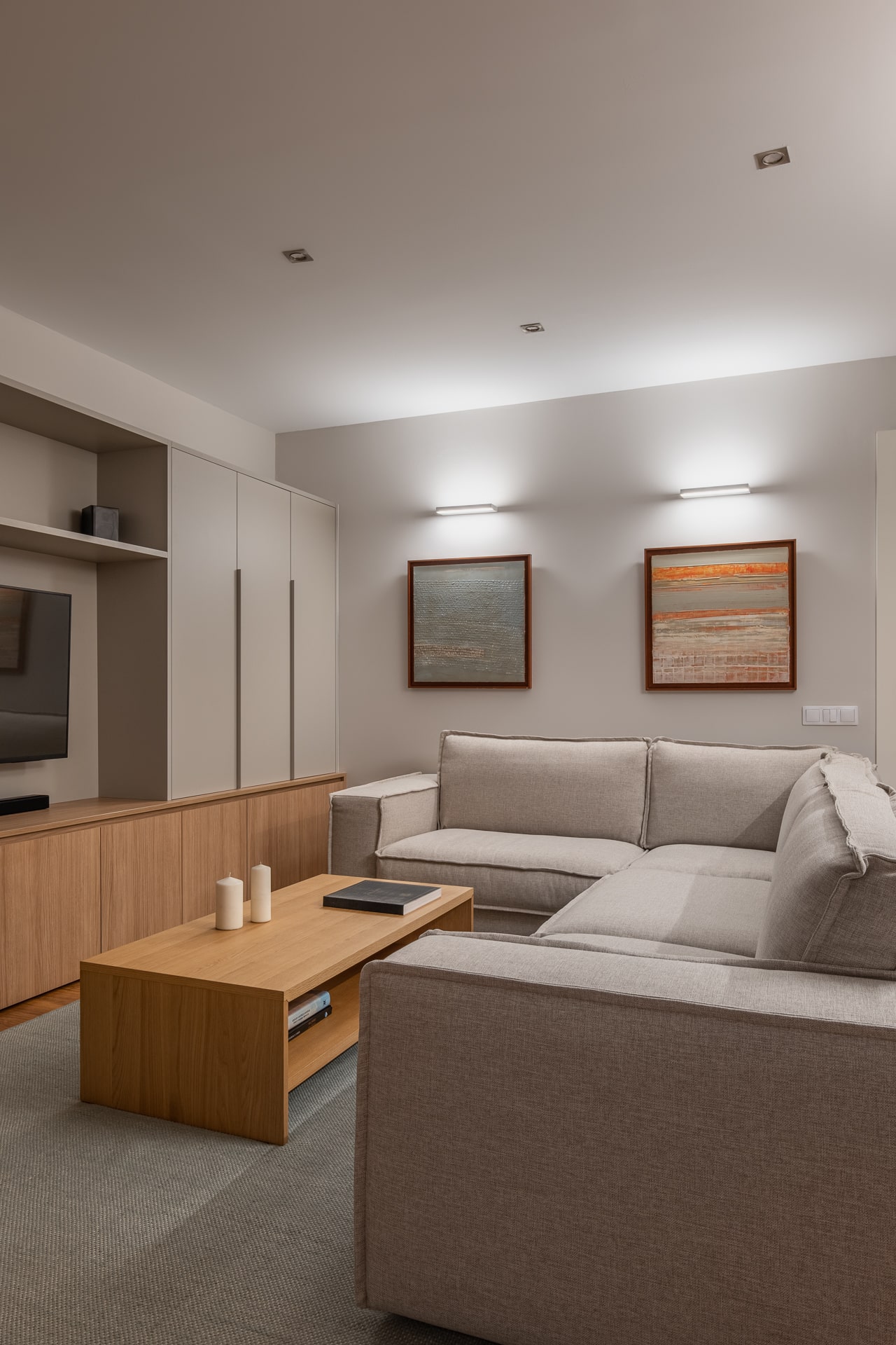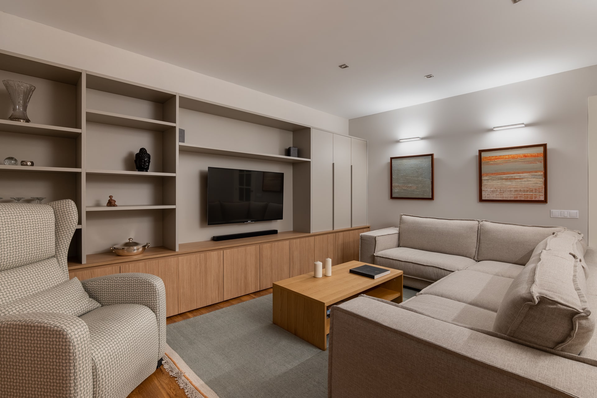 La intervenció elimina elements fixos preexistents que condicionaven la distribució —com prestatgeries i una xemeneia en desús— i aposta per un moble a mida que concentra les funcions d’emmagatzematge i televisió, ordenant visualment la zona d’estar.