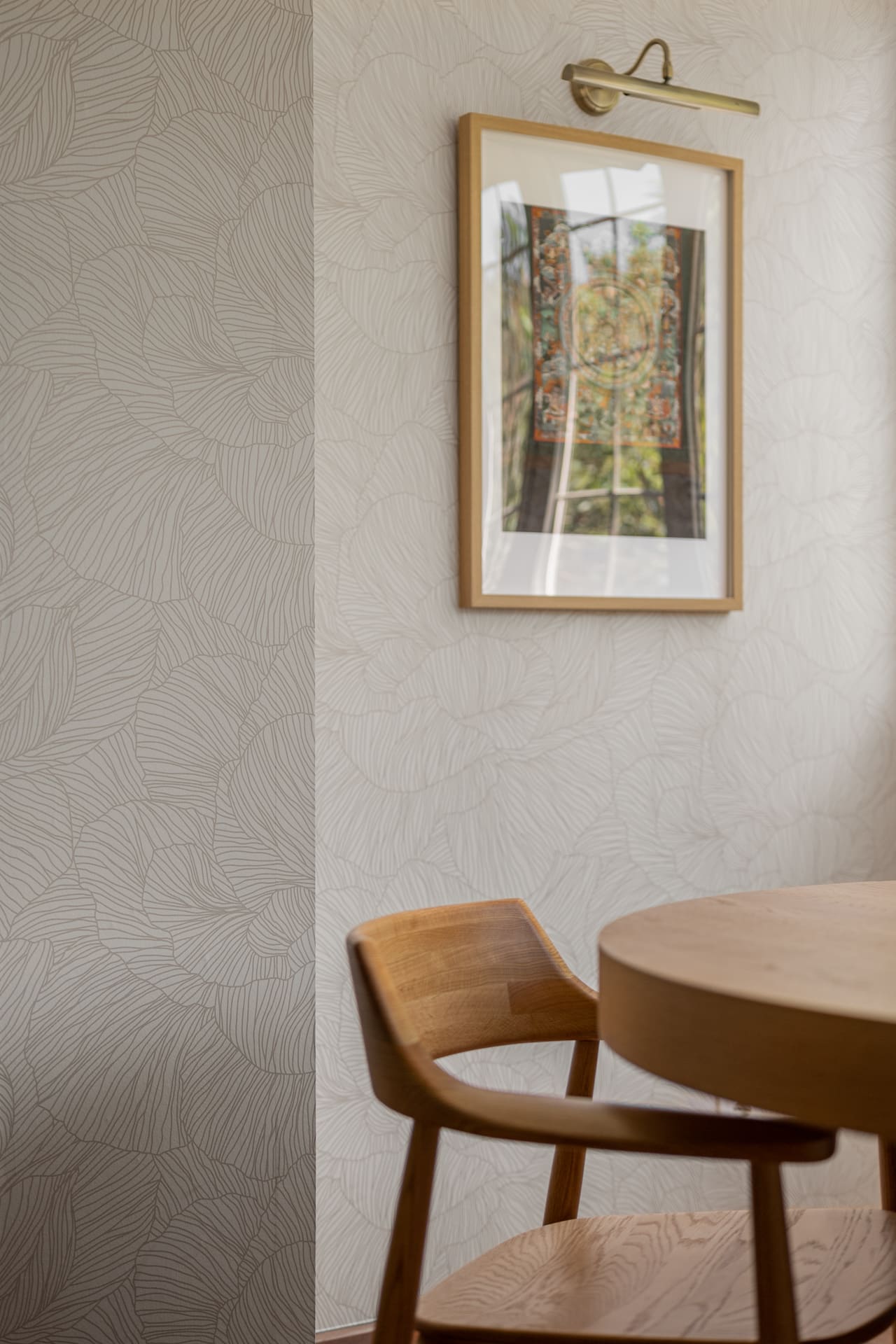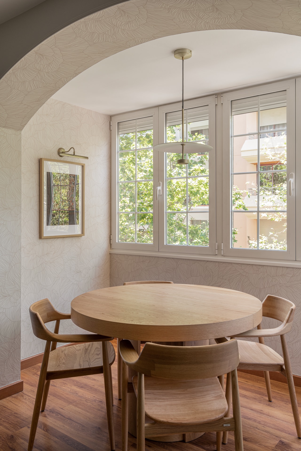 L’antiga ubicació de la xemeneia es transforma en un nou espai de menjador, dotat d’identitat pròpia mitjançant l’empaperat de les parets amb un paper en tons neutres i elegants. Es renova la il·luminació del conjunt, adaptant-la a escenes càlides i coherents amb la nova distribució, i s’actualitza tot el mobiliari de l’espai.
